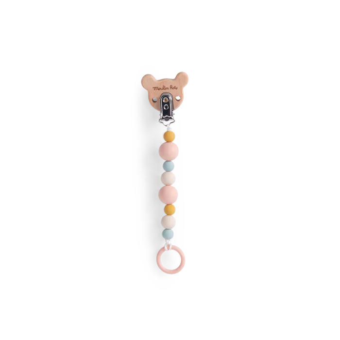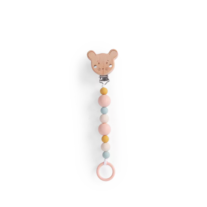 Attache-tétine souris en bois et silicone pour ne plus perdre la sucette de bébé. Les perles de silicone sont sans danger, il pourra jouer avec et les mâchouiller. A clipser sur les vêtements de bébé.