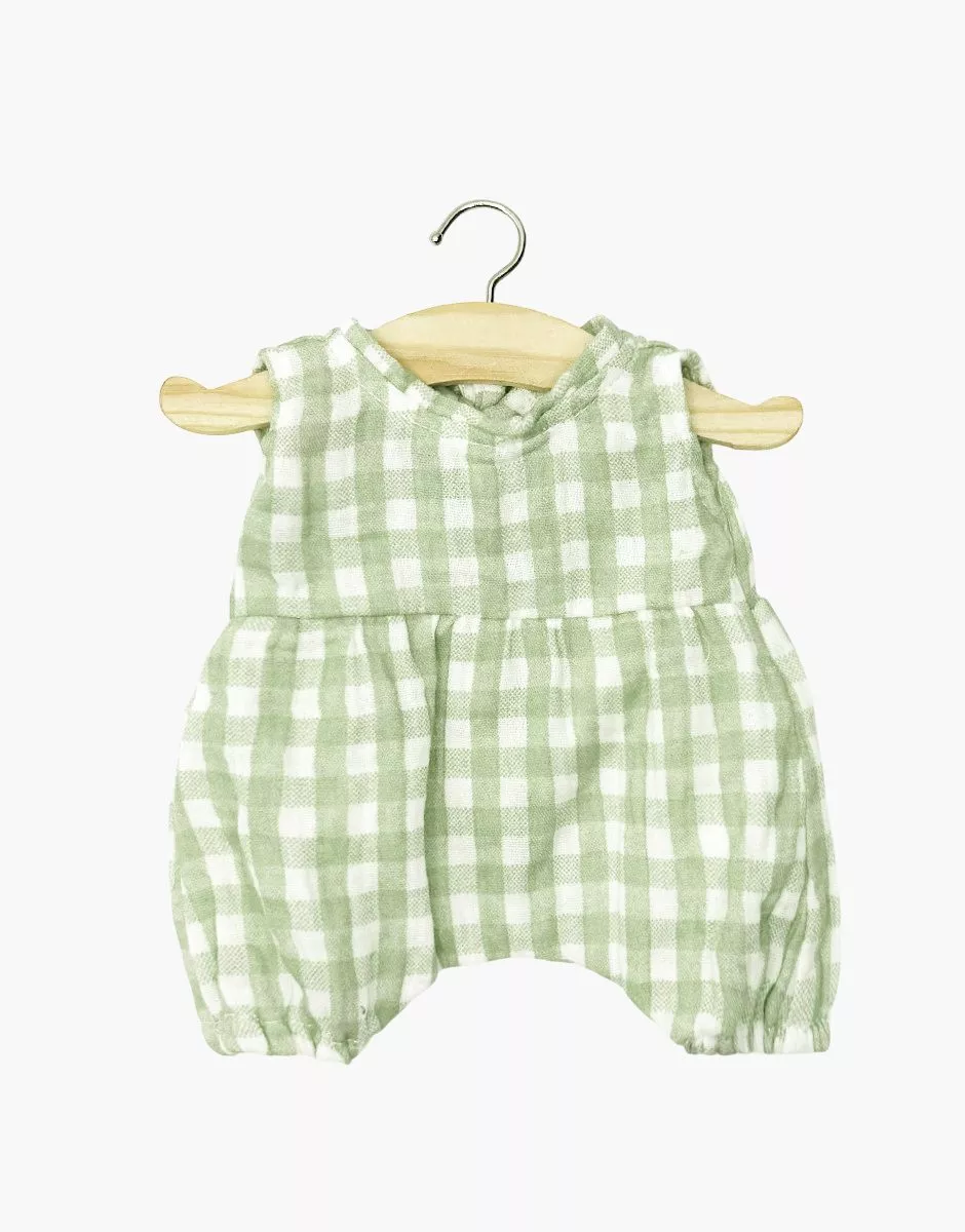 Ensemble Barboteuse Noa Vichy Vert pour poupée Minikane Babies 28 cm : barboteuse, béguin et pochon en coton doux certifié Oeko-Tex. Design français, fabrication française et artisanal.