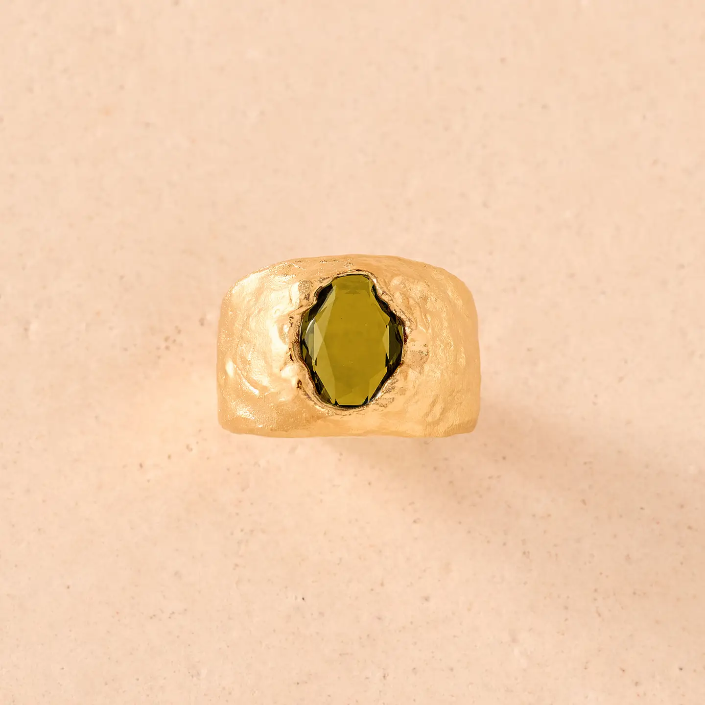 Bague martelée plaquée or avec pierre de verre vert olive. Inspirée de l’antique grecque, puissante et symbolique. Une création Bonnie Bonnie.