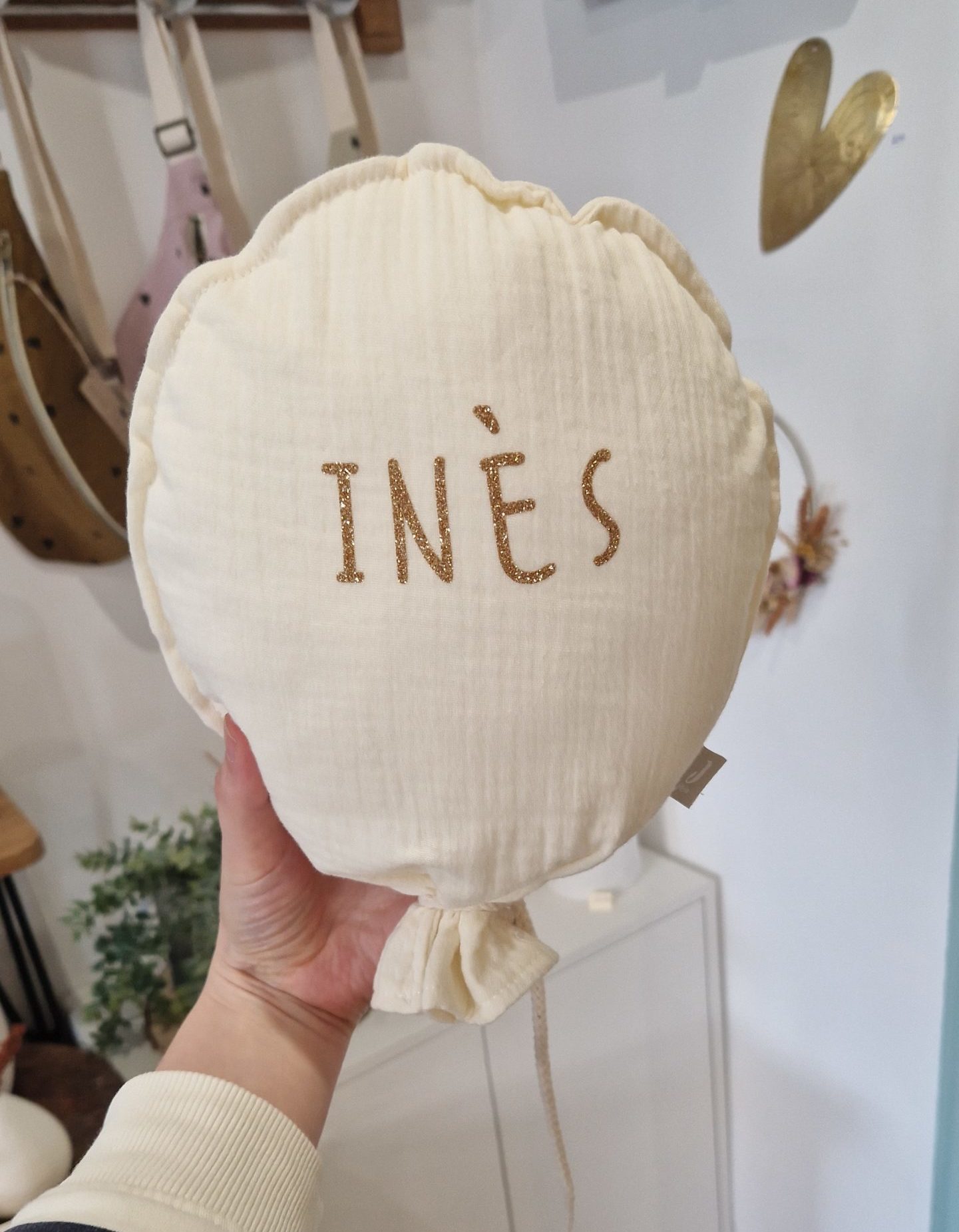 Un crochet en tissu est prévu derrière le ballon pour pouvoir suspendre le ballon décoratif au dessus du lit ou du berceau.