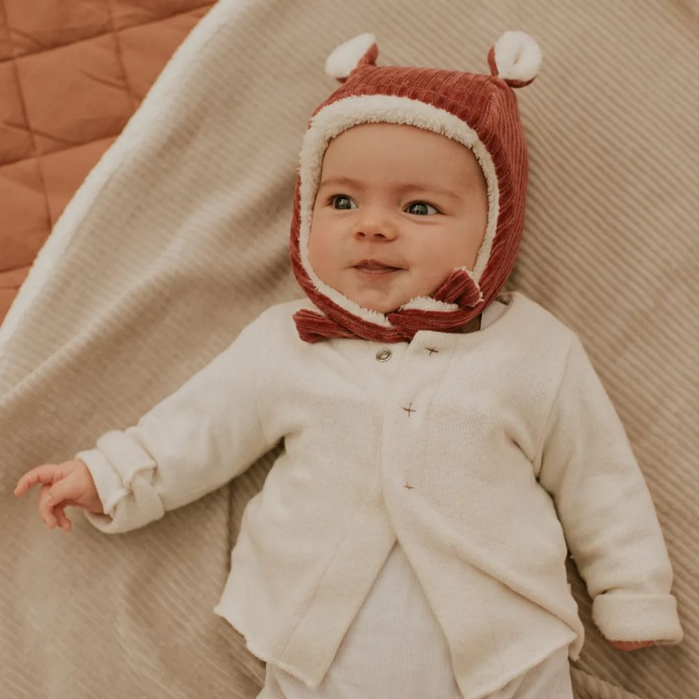 Joli bonnet en velours, doublé. Idéal pour bien couvrir bébé en hiver. Fabriqué en France