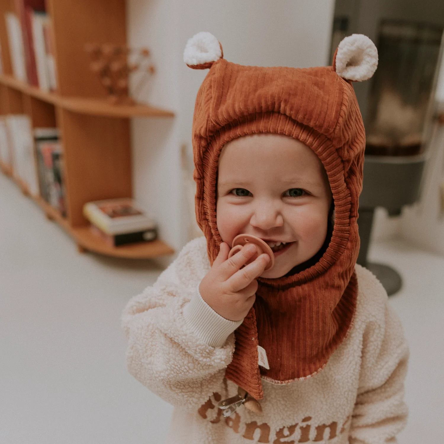 Cagoule Bébé Velours Paprika de la marque RIEN QUE DES BETISES – Chaleur & Style tout en douceur ! Enveloppez votre bébé dans une chaleur réconfortante avec cette cagoule en velours côtelé paprika, entièrement doublée en teddy moelleux. Sa teinte chaleureuse et vibrante apporte une touche de pep’s aux journées froides, tout en protégeant parfaitement les petites têtes ! Retrouvez la marque RIEN QUE DES BETISES chez Bonnie Bonnie !