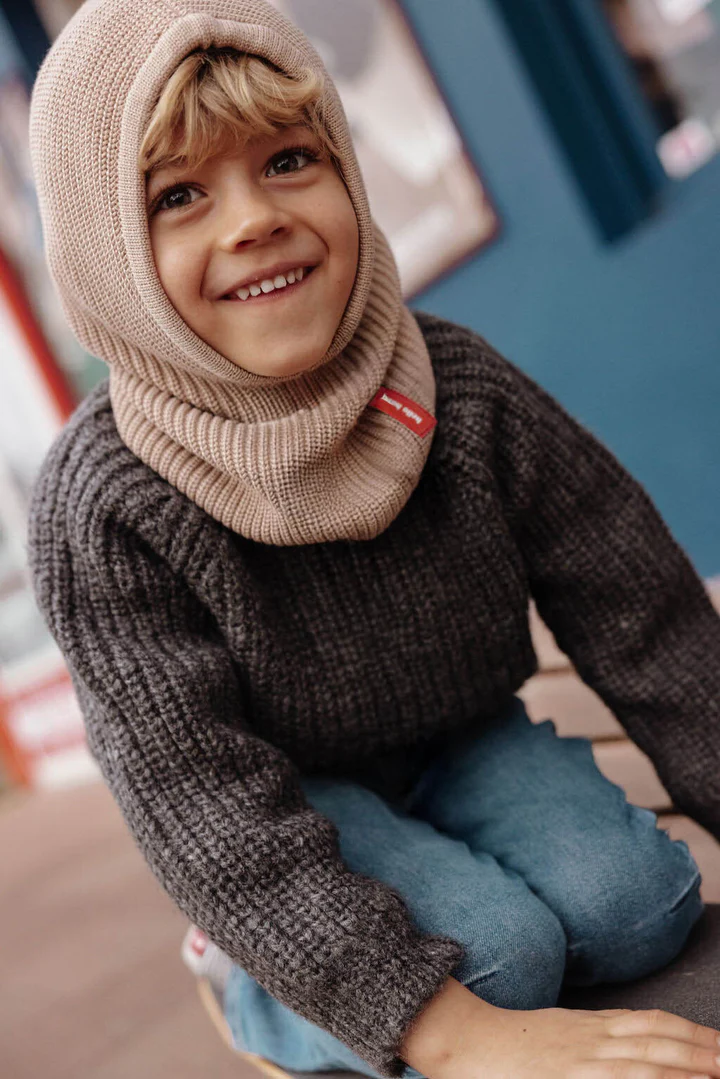 Craquez pour la Cagoule pour enfants et bébés, Hoody Latte, dès 9 mois. Toute douce, bien couvrante, parfaite pour affronter le froid. Maille côtelée unie, en coton bio certifié Oeko-Tex. Aussi cool en version snood. Un essentiel à glisser dans le vestiaire d’hiver. Coton biologique ♻️ Certifiée Oeko-Tex. Maille côtelée unie. Dès 9 mois. Bien couvrante. 2-en-1 cagoule et snood. Essentiel hiver.