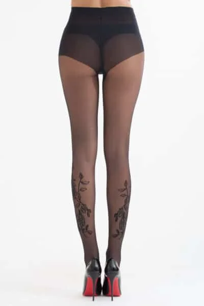Collant fin, fantaisie florale aux légères touches dorées, slip tanga, gousset coton, ligne nue, pointes renforcées, coutures plates. Coloris disponible : noir Taille disponible : MEDIUM