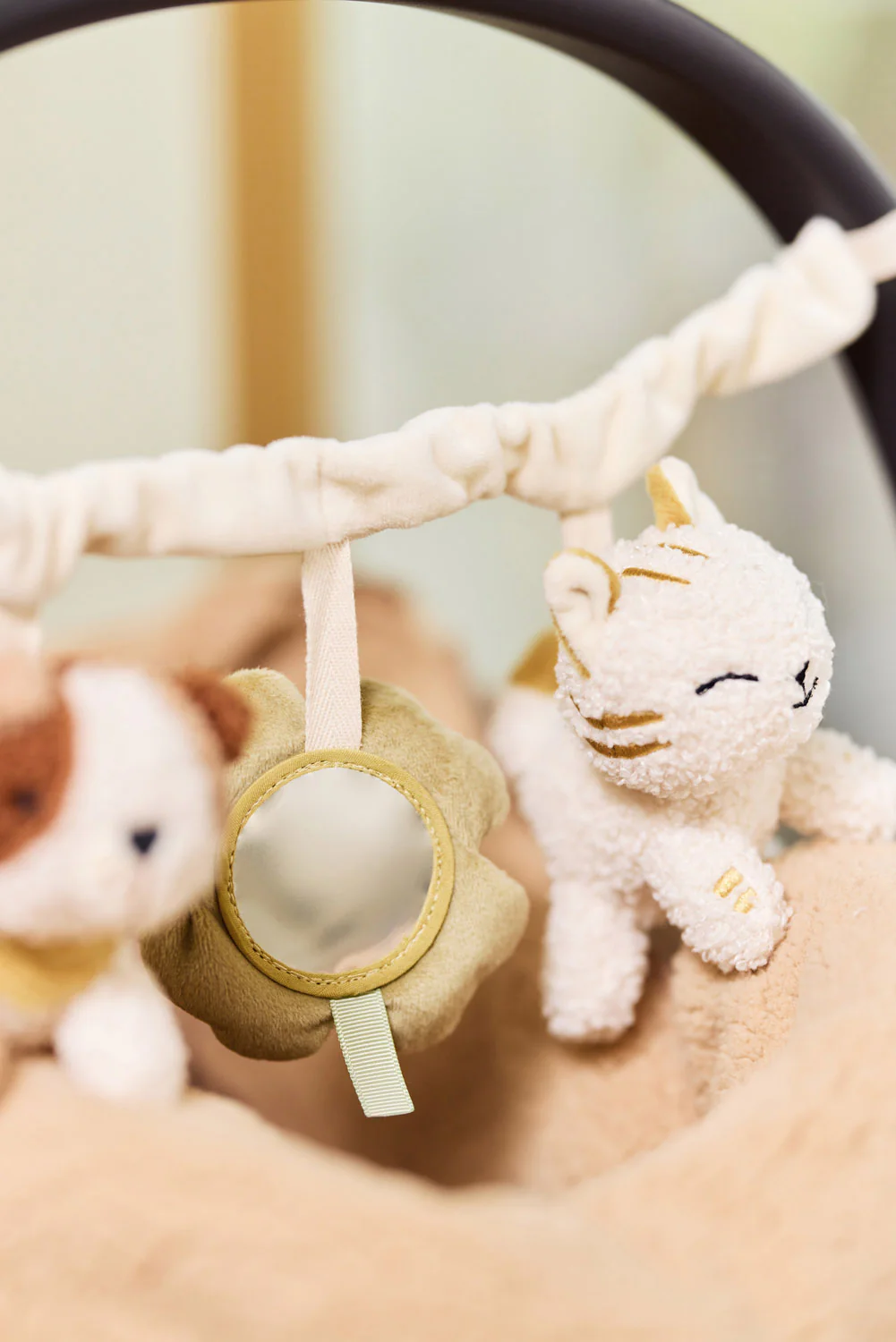 Cet adorable jouet de poussette Tiny Park est parfait pour divertir bébé en balade. Il contient un petit chien, un chat et un trèfle à quatre feuilles avec un mini miroir intégré. Les petits grelots diffusent un son apaisant – un jouet idéal à emporter partout !