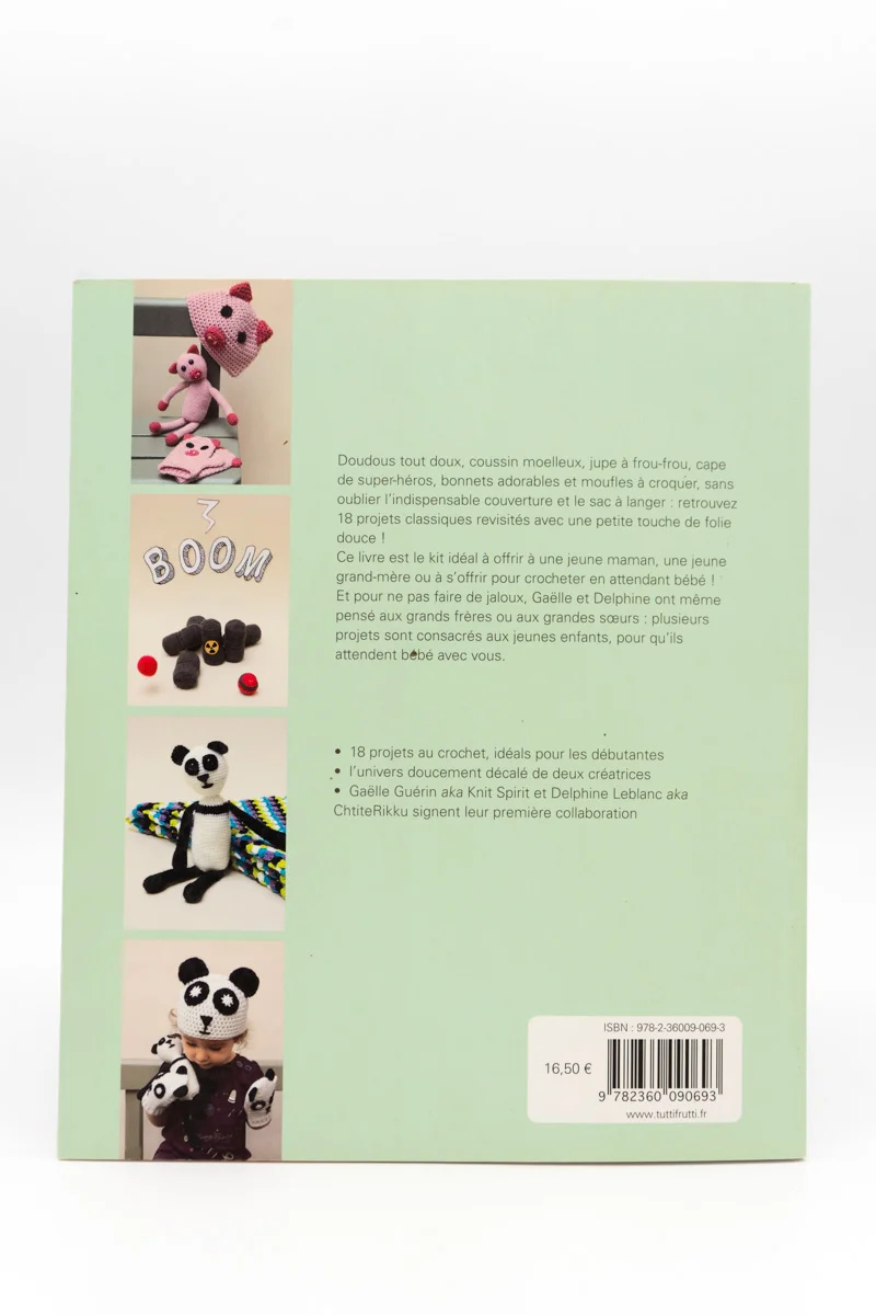 Doudous tout doux, coussin moelleux, jupe à frou-frou, cape de super-héros, bonnets adorables et moufles à croquer, sans oublier l’indispensable couverture et le sac à langer : retrouvez 18 projets classiques revisités avec une petite touche de folie douce ! Ce livre est le kit idéal à offrir à une jeune maman, une jeune grand-mère ou à s’offrir pour crocheter en attendant bébé ! Et pour ne pas faire de jaloux, Gaëlle et Delphine ont même pensé aux grands frères ou aux grandes sœurs : plusieurs projets sont consacrés aux jeunes enfants, pour qu’ils attendent bébé avec vous.