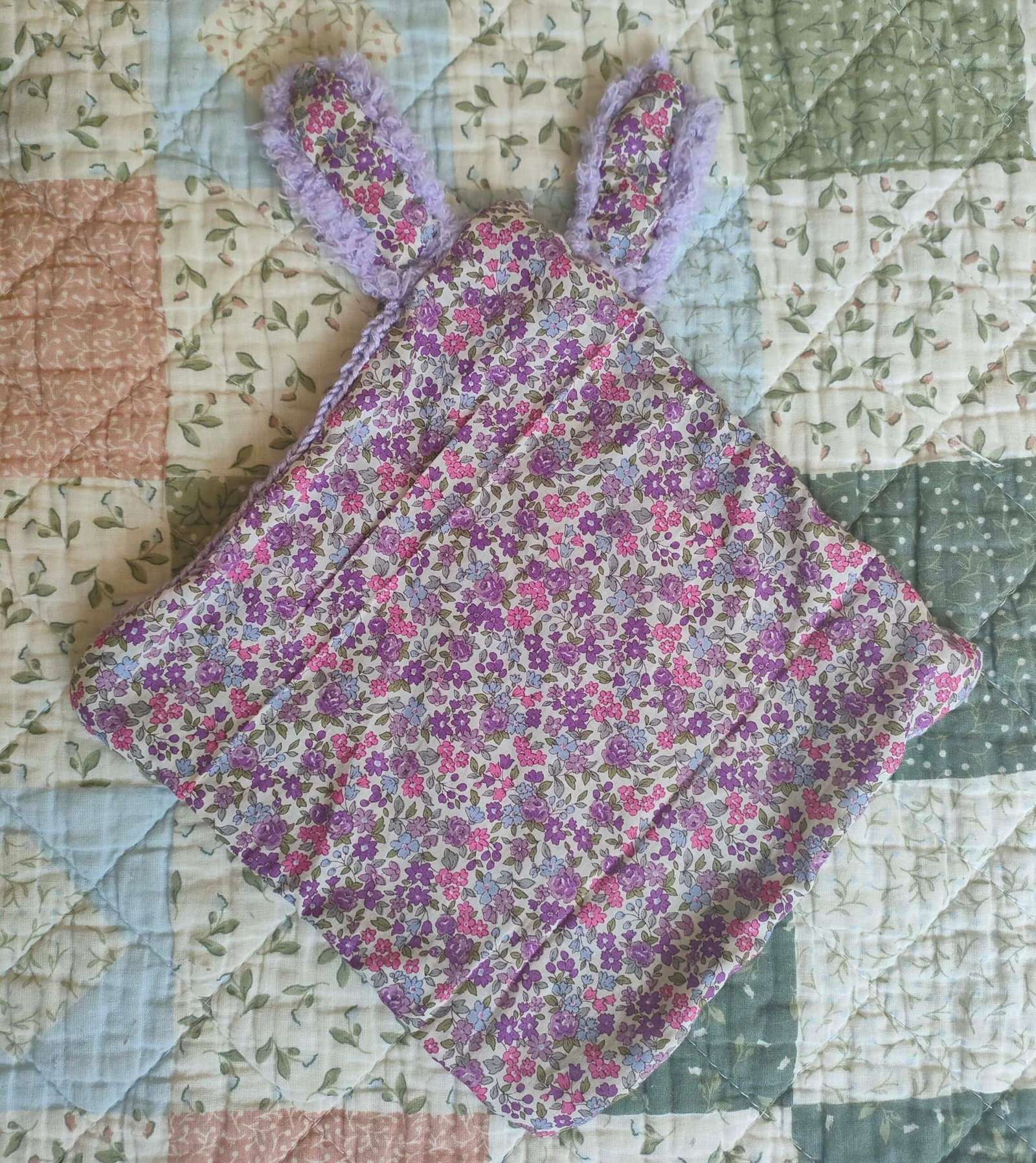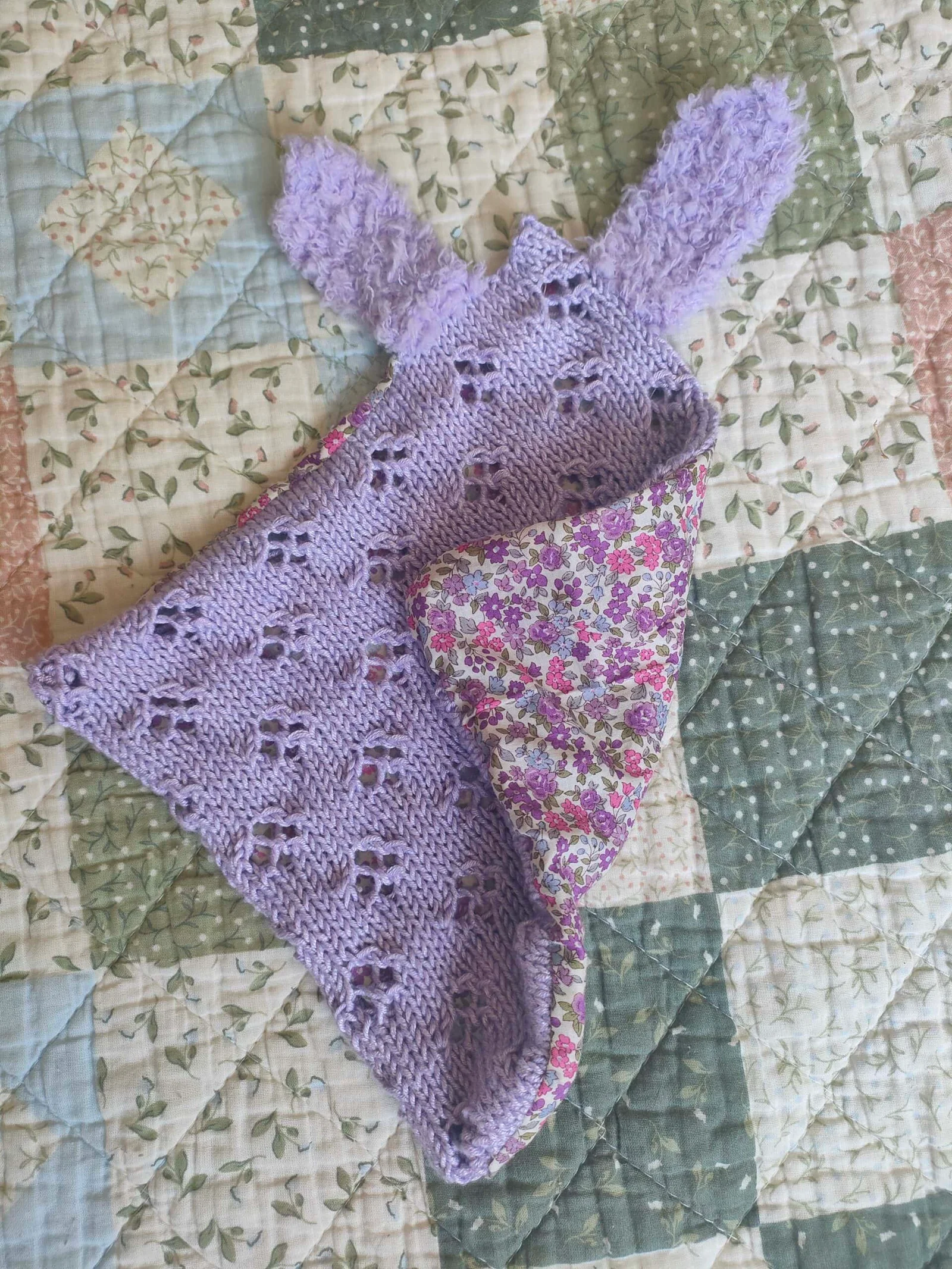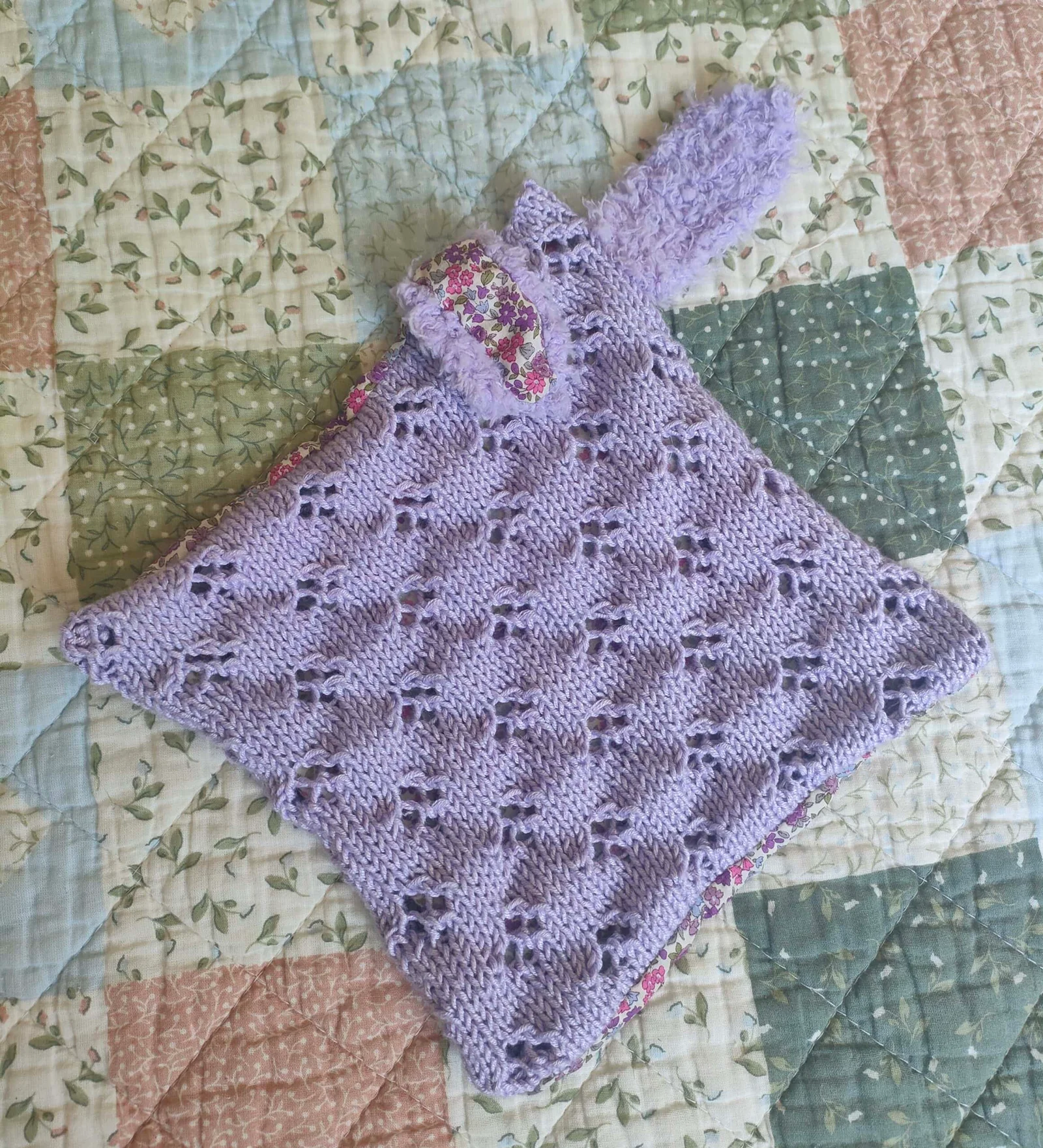 Doudou très doux entièrement réalisé à la main, en viscose de bambou d’un côté, et en tissu « Liberty » de l’autre. Le côté en bambou est tricoté en points ajourés. Les oreilles sont tricotées avec une laine « pilou pilou » d’une grande douceur et sont facilement attrapables par les petites mains de bébé. Dimensions du doudou : 30 cm de hauteur (35 cm avec les oreilles) sur 30 cm de large. Lavage à la main ou en machine programme délicat à 30°.
