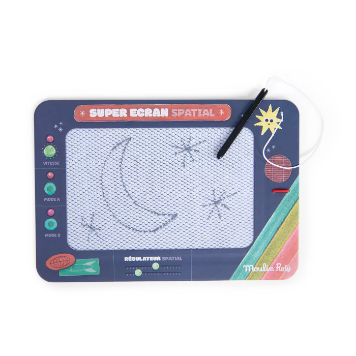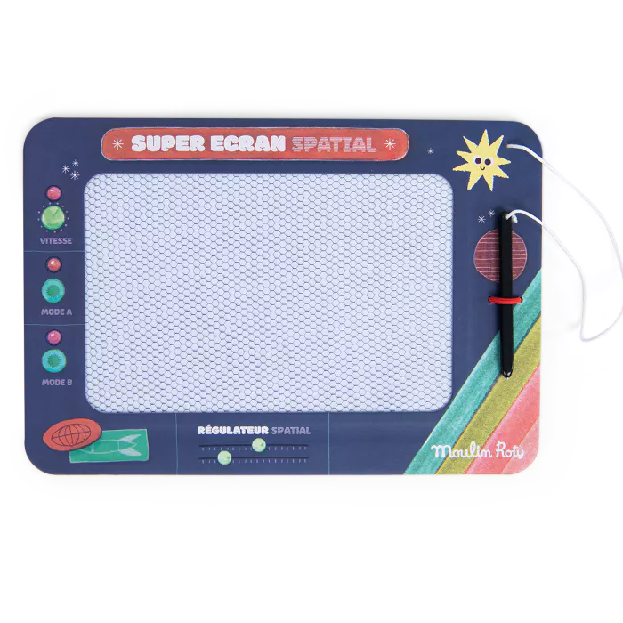 Principe de l’ardoise magique pour cet écran magnétique illustré comme un écran de contrôle d’une fusée spatiale : boutons, curseurs … Avec le stylet, sur la partie alvéolée, l’enfant peut écrire et dessiner dessus à l’infini ! Pour effacer le message, il suffit de tapoter sur l’ardoise.