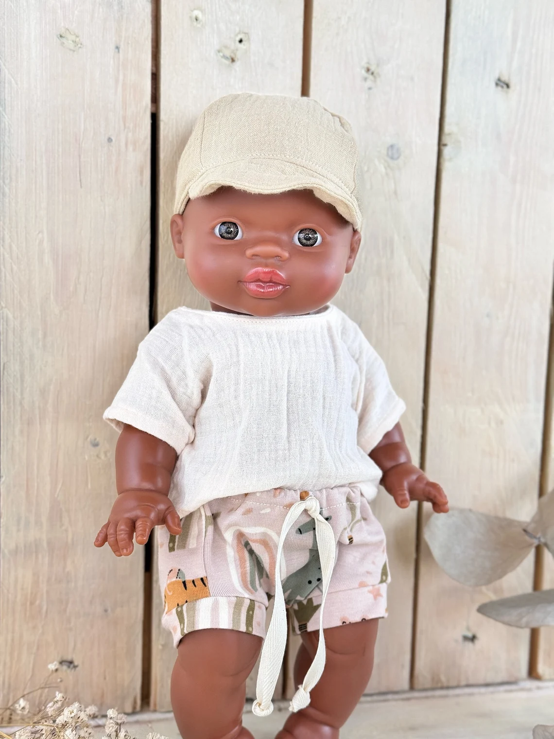 Oh la belle tenue ! Craquez pour ce bel ensemble, un tee-shirt blanc avec son short aux jolis imprimés safari. Conçu pour les poupées Minikane Gordis de 34 cm.