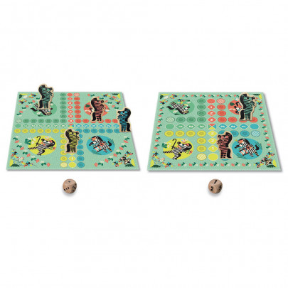 Jeu de petits chevaux version savane avec plateau réversible et pions zèbres, idéal dès 3 ans.