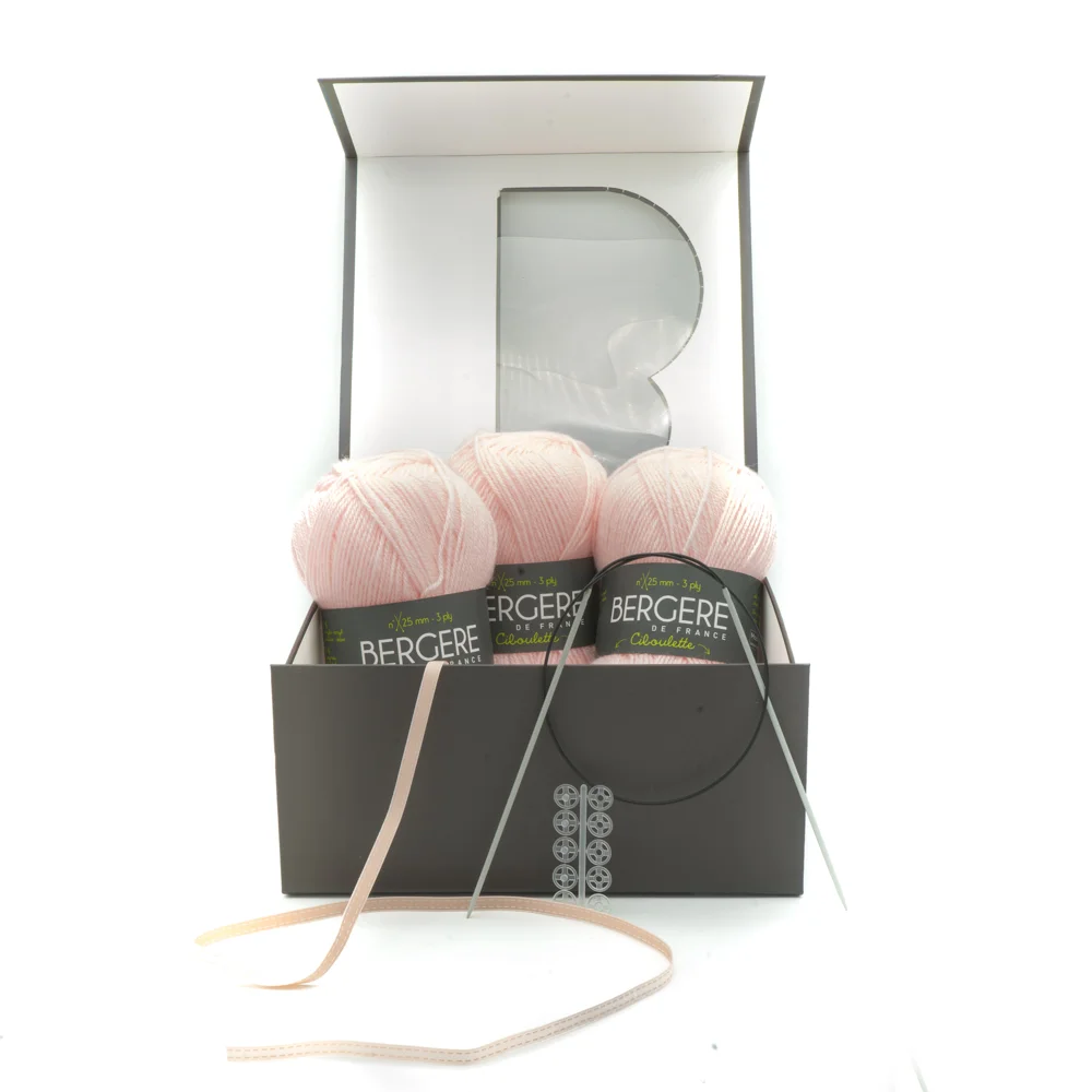 Quoi de plus satisfaisant que de réaliser soi-même la 1ère layette de son bébé ? Un écrin de douceur avec une jolie couleur pastel bleue ou rose, et un fil délicat spécial bébé. Livré avec un livret explicatif où vous retrouverez les points de base qui accompagneront le tuto, un ruban, les boutons pressions, et les aiguilles à tricoter.