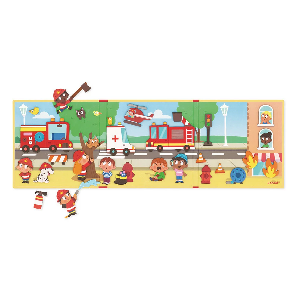 Un petit chat à sauver, le feu à éteindre, le gros bobo d’une enfant … Heureusement, les pompiers sont là pour gérer la situation ! Ce jeu magnétique ravira vos enfants, les invitant à s’imaginer en vrais petits pompiers, dès l’âge de 3 ans. Ce jeu aimanté se compose d’une planche illustrée aux couleurs des soldats du feu ainsi que de 30 magnets à venir déposer sur le décor. Une fois déposés, les aimants vont peu à peu prendre vie grâce à l’imagination de votre enfant. Le petit chat se mettra à miauler et la petite fille sèchera finalement ses…