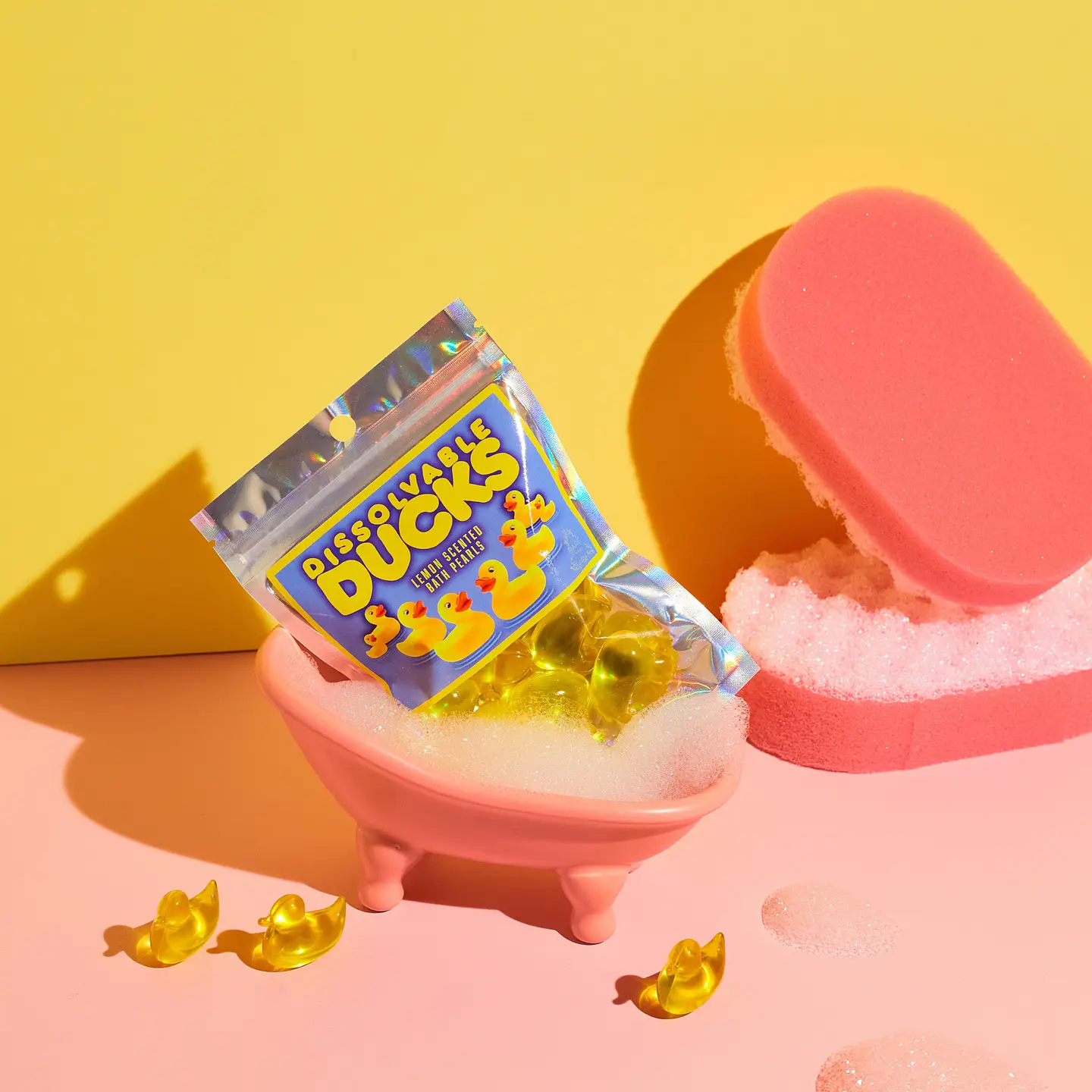 Des perles de bain en forme de canard, parfum citron, qui se dissolvent doucement dans l’eau, pour un bain ludique, parfumé et biodégradable !