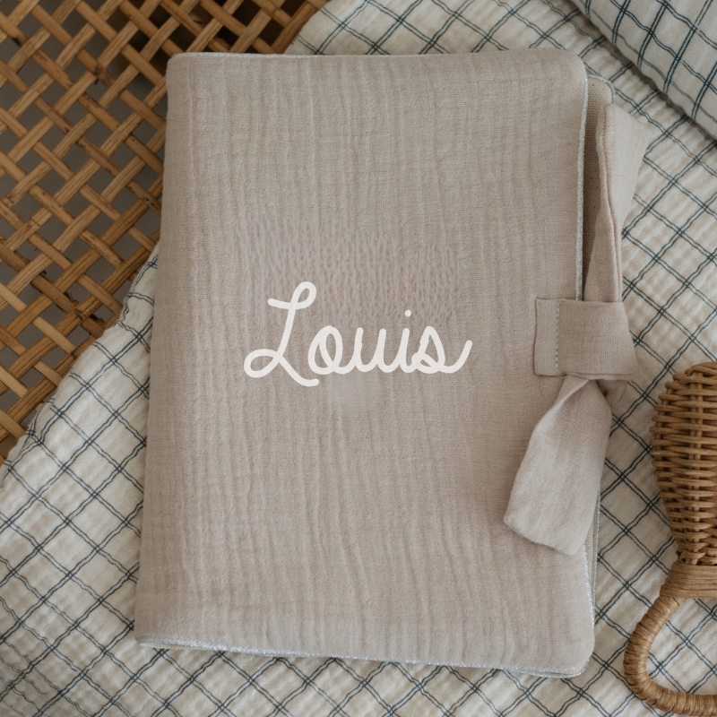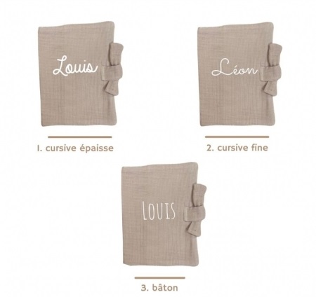Un très joli carnet de santé à personnaliser en gaze de coton doublé avec de la toile de coton. Il est personnalisable à souhait au prénom de votre enfant. Pour choisir votre personnalisation, faites défiler les photos jusqu’à trouver l’image avec les couleurs et les polices d’écritures disponibles. Juste en dessous, choisissez le numéro correspondant à la couleur et l’écriture.