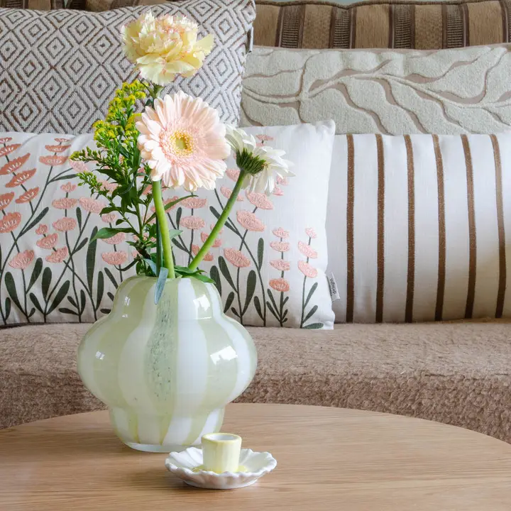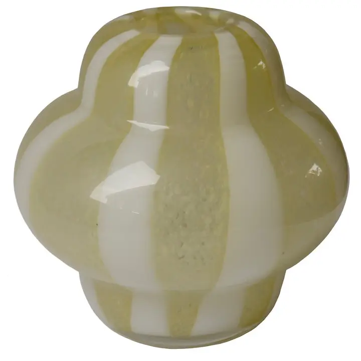 Vase jaune rayures Mila – verre soufflé Ø15,5 x 14,5 cm. Pièce artisanale à découvrir chez BONNIE BONNIE.